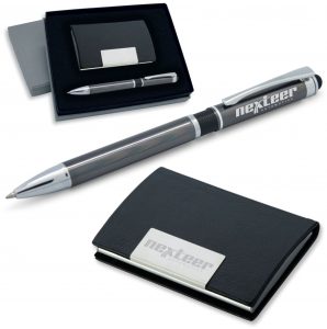 2-piece gift set of a black leather business card case and a matching 2-in-1 stylus ballpoint pen